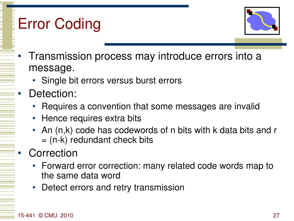 Error Coding • Transmission process may introduce errors into a message. • Single bit errors versus burst errors • Detection: • Requires a convention that some messages are invalid • Hence requires extra bits • An (n,k) code has codewords of n bits with k data bits and r = (n-k) redundant check bits • Correction • Forward error correction: many related code words map to the same data word • Detect errors and retry transmission