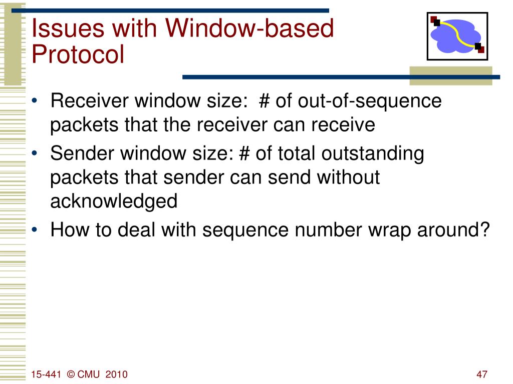 Issues with Window-based Protocol • Receiver window size: # of out-of-sequence packets that the receiver can receive • Sender window size: # of total outstanding packets that sender can send without acknowledged • How to deal with sequence number wrap around?