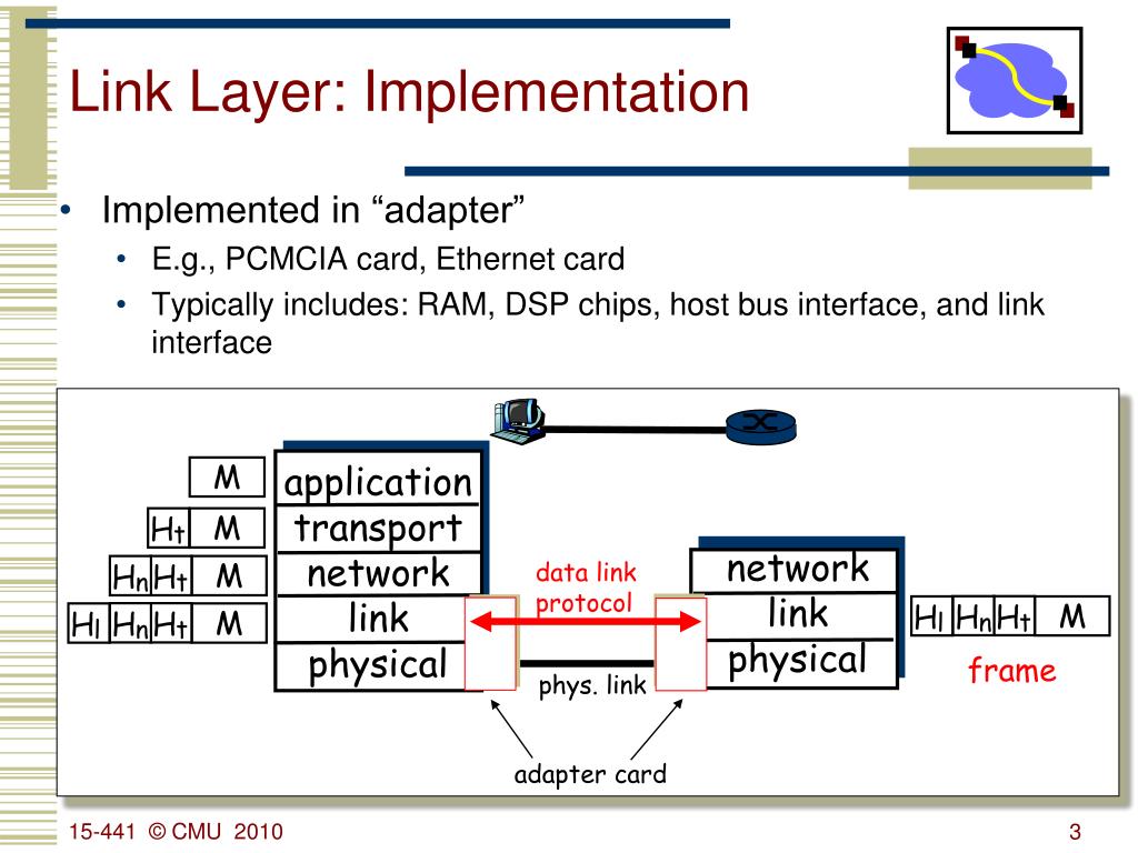 M H H H H H H H H H t n l t t n l t n M M application transport network link physical M Link Layer: Implementation • Implemented in “adapter” • E.g., PCMCIA card, Ethernet card • Typically includes: RAM, DSP chips, host bus interface, and link interface network link physical data link protocol M frame phys. link adapter card