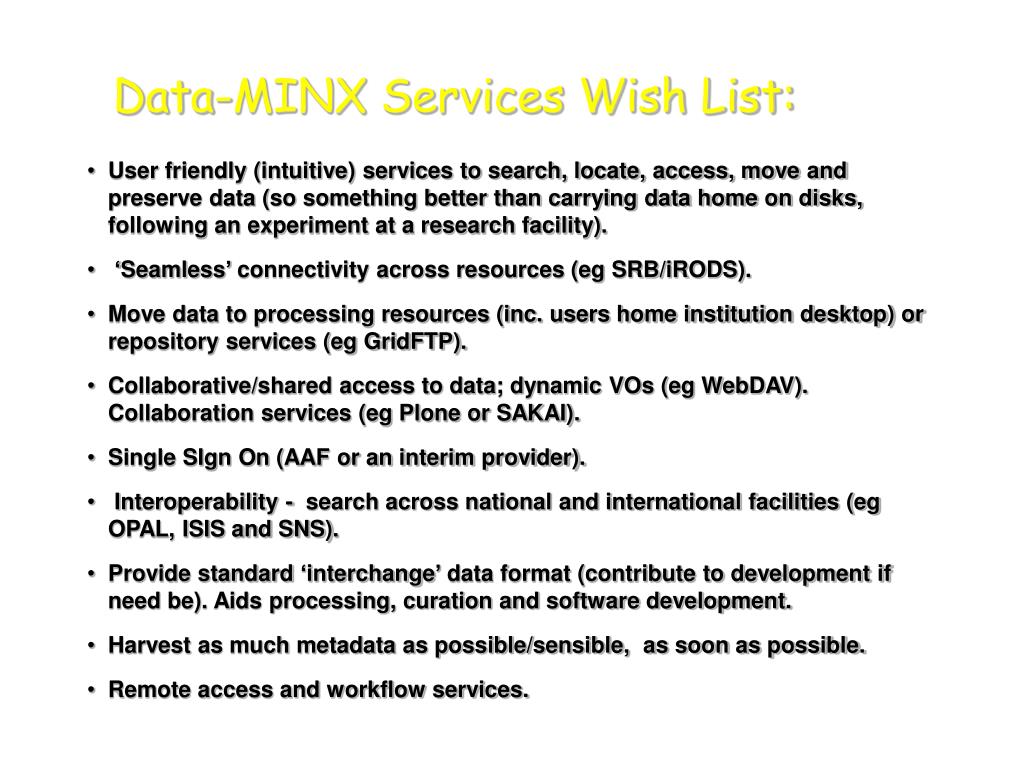 Data-MINX Services Wish List: • User friendly (intuitive) services to search, locate, access, move and preserve data (so something better than carrying data home on disks, following an experiment at a research facility). • ‘Seamless’ connectivity across resources (eg SRB/iRODS). • Move data to processing resources (inc. users home institution desktop) or repository services (eg GridFTP). • Collaborative/shared access to data; dynamic VOs (eg WebDAV). Collaboration services (eg Plone or SAKAI). • Single SIgn On (AAF or an interim provider). • Interoperability - search across national and international facilities (eg OPAL, ISIS and SNS). • Provide standard ‘interchange’ data format (contribute to development if need be). Aids processing, curation and software development. • Harvest as much metadata as possible/sensible, as soon as possible. • Remote access and workflow services.
