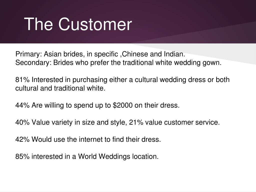 The Customer Primary: Asian brides, in specific ,Chinese and Indian.Secondary: Brides who prefer the traditional white wedding gown. 81% Interested in purchasing either a cultural wedding dress or both cultural and traditional white. 44% Are willing to spend up to $2000 on their dress. 40% Value variety in size and style, 21% value customer service. 42% Would use the internet to find their dress. 85% interested in a World Weddings location.