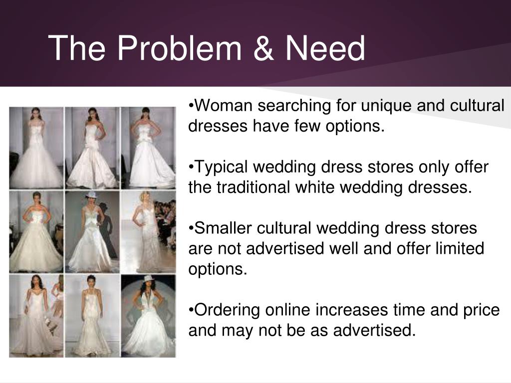 The Problem & Need • •Woman searching for unique and cultural dresses have few options. • Typical wedding dress stores only offer the traditional white wedding dresses. • •Smaller cultural wedding dress stores are not advertised well and offer limited options. • Ordering online increases time and price and may not be as advertised.