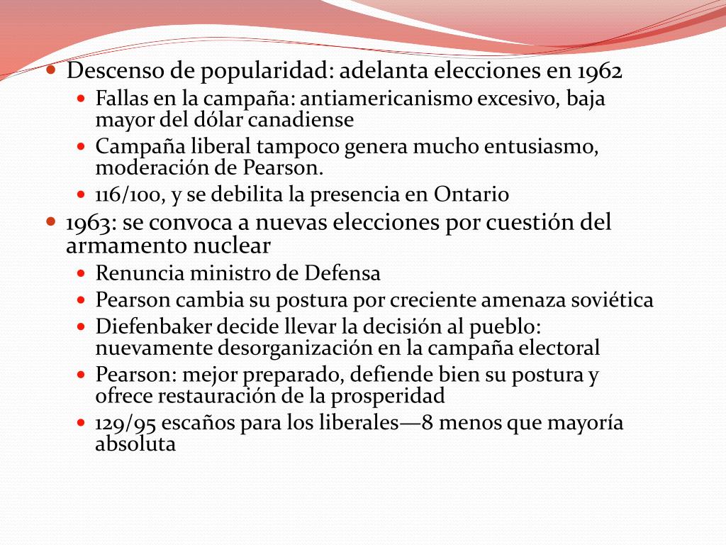 Descenso de popularidad: adelanta elecciones en 1962 • Fallas en la campaña: antiamericanismo excesivo, baja mayor del dólar canadiense • Campaña liberal tampoco genera mucho entusiasmo, moderación de Pearson. • 116/100, y se debilita la presencia en Ontario • 1963: se convoca a nuevas elecciones por cuestión del armamento nuclear • Renuncia ministro de Defensa • Pearson cambia su postura por creciente amenaza soviética • Diefenbaker decide llevar la decisión al pueblo: nuevamente desorganización en la campaña electoral • Pearson: mejor preparado, defiende bien su postura y ofrece restauración de la prosperidad • 129/95 escaños para los liberales—8 menos que mayoría absoluta