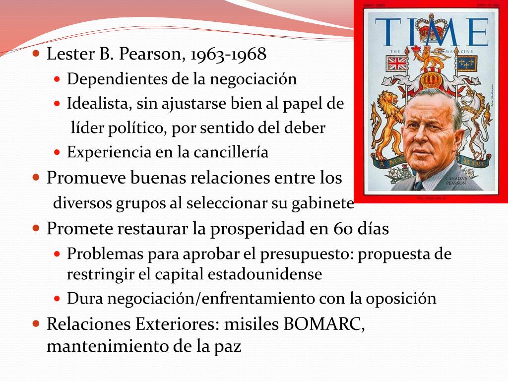 Lester B. Pearson, 1963-1968 • Dependientes de la negociación • Idealista, sin ajustarse bien al papel de líder político, por sentido del deber • Experiencia en la cancillería • Promueve buenas relaciones entre los diversos grupos al seleccionar su gabinete • Promete restaurar la prosperidad en 60 días • Problemas para aprobar el presupuesto: propuesta de restringir el capital estadounidense • Dura negociación/enfrentamiento con la oposición • Relaciones Exteriores: misiles BOMARC, mantenimiento de la paz