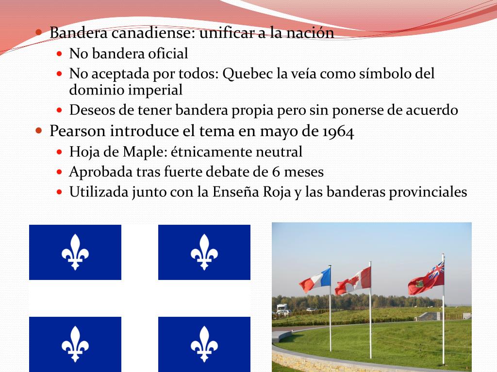 Bandera canadiense: unificar a la nación • No bandera oficial • No aceptada por todos: Quebec la veía como símbolo del dominio imperial • Deseos de tener bandera propia pero sin ponerse de acuerdo • Pearson introduce el tema en mayo de 1964 • Hoja de Maple: étnicamente neutral • Aprobada tras fuerte debate de 6 meses • Utilizada junto con la Enseña Roja y las banderas provinciales