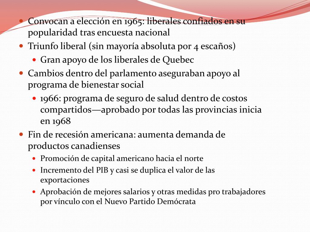 Convocan a elección en 1965: liberales confiados en su popularidad tras encuesta nacional • Triunfo liberal (sin mayoría absoluta por 4 escaños) • Gran apoyo de los liberales de Quebec • Cambios dentro del parlamento aseguraban apoyo al programa de bienestar social • 1966: programa de seguro de salud dentro de costos compartidos—aprobado por todas las provincias inicia en 1968 • Fin de recesión americana: aumenta demanda de productos canadienses • Promoción de capital americano hacia el norte • Incremento del PIB y casi se duplica el valor de las exportaciones • Aprobación de mejores salarios y otras medidas pro trabajadores por vínculo con el Nuevo Partido Demócrata