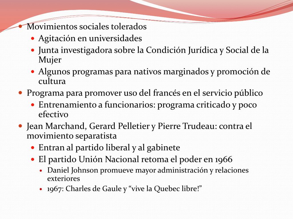 Movimientos sociales tolerados • Agitación en universidades • Junta investigadora sobre la Condición Jurídica y Social de la Mujer • Algunos programas para nativos marginados y promoción de cultura • Programa para promover uso del francés en el servicio público • Entrenamiento a funcionarios: programa criticado y poco efectivo • Jean Marchand, Gerard Pelletier y Pierre Trudeau: contra el movimiento separatista • Entran al partido liberal y al gabinete • El partido Unión Nacional retoma el poder en 1966 • Daniel Johnson promueve mayor administración y relaciones exteriores • 1967: Charles de Gaule y “vive la Quebec libre!”