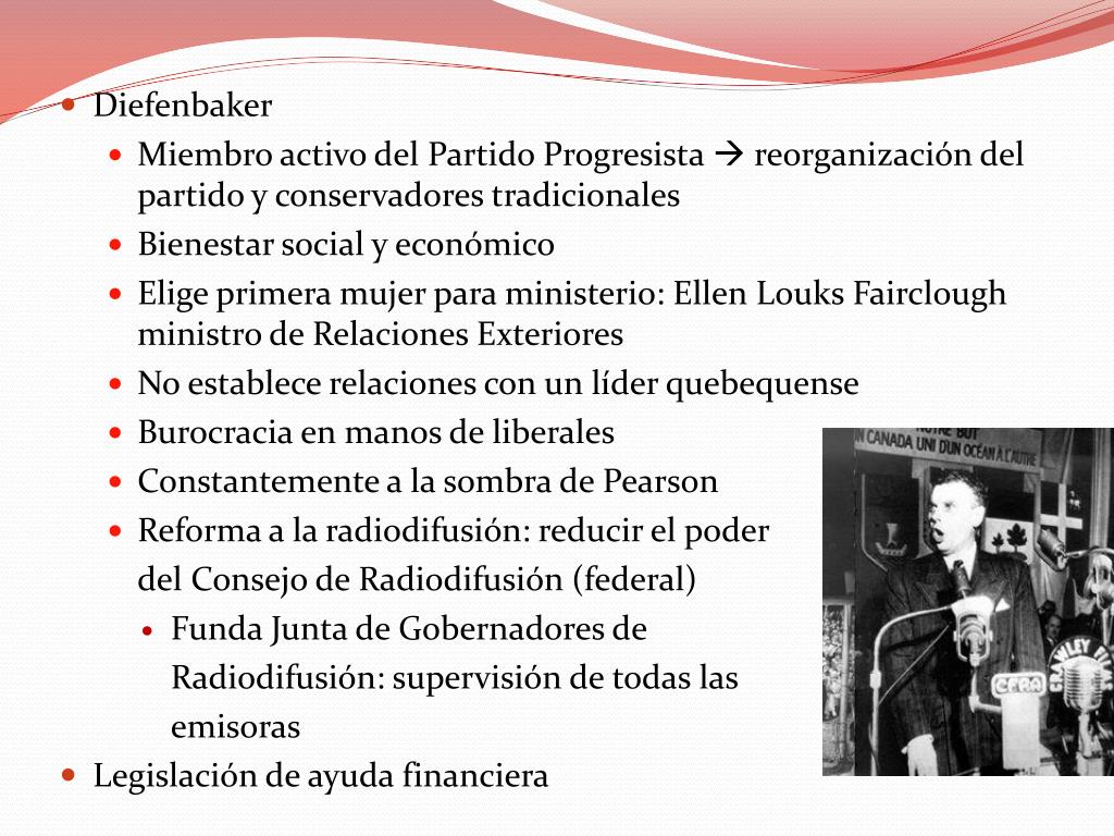 Diefenbaker • Miembro activo del Partido Progresista reorganización del partido y conservadores tradicionales • Bienestar social y económico • Elige primera mujer para ministerio: Ellen LouksFairclough ministro de Relaciones Exteriores • No establece relaciones con un líder quebequense • Burocracia en manos de liberales • Constantemente a la sombra de Pearson • Reforma a la radiodifusión: reducir el poder del Consejo de Radiodifusión (federal) • Funda Junta de Gobernadores de Radiodifusión: supervisión de todas las emisoras • Legislación de ayuda financiera