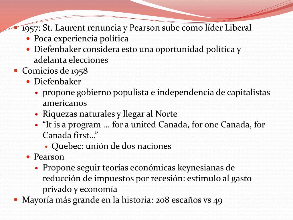 1957: St. Laurent renuncia y Pearson sube como líder Liberal • Poca experiencia política • Diefenbaker considera esto una oportunidad política y adelanta elecciones • Comicios de 1958 • Diefenbaker • propone gobierno populista e independencia de capitalistas americanos • Riquezas naturales y llegar al Norte • “It is a program ... for a united Canada, for one Canada, for Canada first…” • Quebec: unión de dos naciones • Pearson • Propone seguir teorías económicas keynesianas de reducción de impuestos por recesión: estimulo al gasto privado y economía • Mayoría más grande en la historia: 208 escaños vs 49