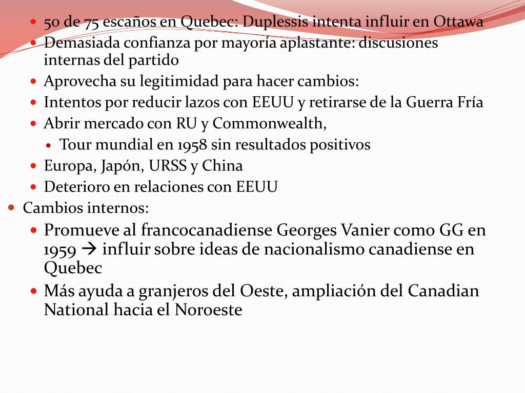 50 de 75 escaños en Quebec: Duplessis intenta influir en Ottawa • Demasiada confianza por mayoría aplastante: discusiones internas del partido • Aprovecha su legitimidad para hacer cambios: • Intentos por reducir lazos con EEUU y retirarse de la Guerra Fría • Abrir mercado con RU y Commonwealth, • Tour mundial en 1958 sin resultados positivos • Europa, Japón, URSS y China • Deterioro en relaciones con EEUU • Cambios internos: • Promueve al francocanadiense Georges Vanier como GG en 1959 influir sobre ideas de nacionalismo canadiense en Quebec • Más ayuda a granjeros del Oeste, ampliación del Canadian National hacia el Noroeste