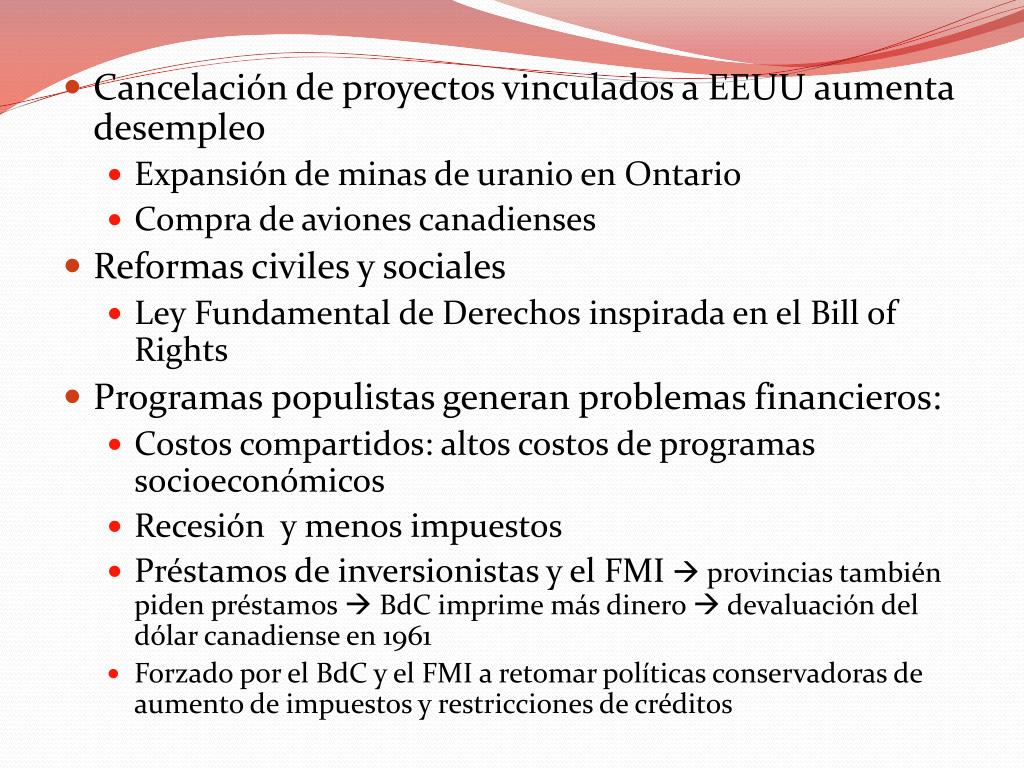 Cancelación de proyectos vinculados a EEUU aumenta desempleo • Expansión de minas de uranio en Ontario • Compra de aviones canadienses • Reformas civiles y sociales • Ley Fundamental de Derechos inspirada en el Bill of Rights • Programas populistas generan problemas financieros: • Costos compartidos: altos costos de programas socioeconómicos • Recesión y menos impuestos • Préstamos de inversionistas y el FMI provincias también piden préstamos BdC imprime más dinero devaluación del dólar canadiense en 1961 • Forzado por el BdC y el FMI a retomar políticas conservadoras de aumento de impuestos y restricciones de créditos