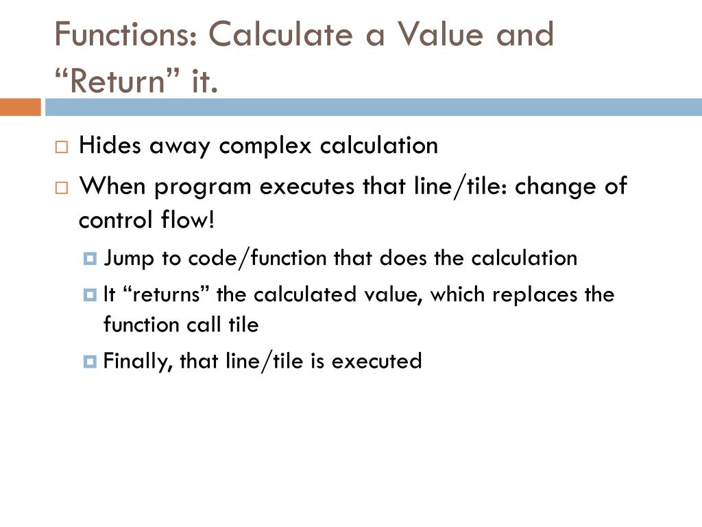 Functions: Calculate a Value and “Return” it. • Hides away complex calculation • When program executes that line/tile: change of control flow! • Jump to code/function that does the calculation • It “returns” the calculated value, which replaces the function call tile • Finally, that line/tile is executed