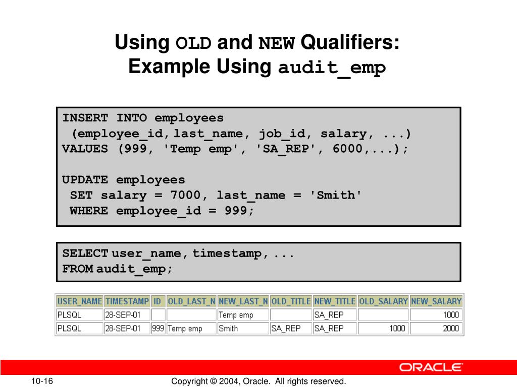 Using OLD and NEW Qualifiers:Example Using audit_emp INSERT INTO employees (employee_id,last_name, job_id, salary, ...) VALUES (999, 'Temp emp', 'SA_REP', 6000,...); UPDATE employees SET salary = 7000, last_name = 'Smith' WHERE employee_id = 999; SELECTuser_name,timestamp,... FROMaudit_emp;