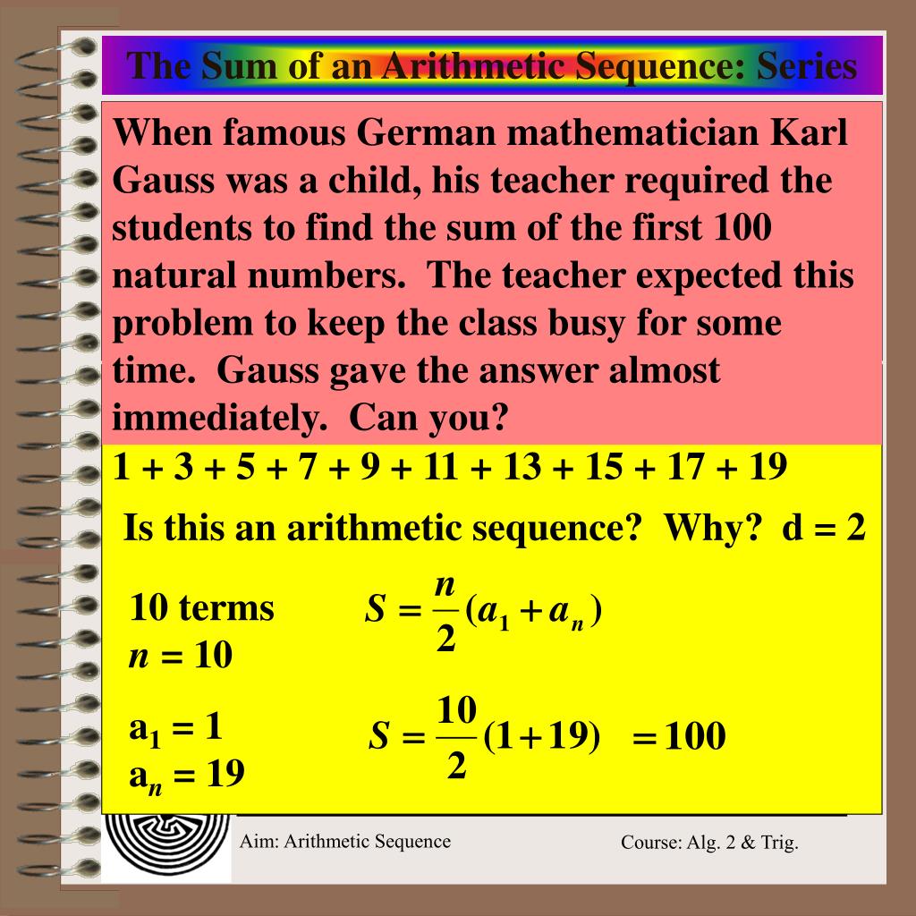 The sum of a finite arithmetic sequence with n terms is An arithmetic series is the indicated sum of the terms of an arithmetic sequence. Find the following sum 1 + 3 + 5 + 7 + 9 + 11 + 13 + 15 + 17 + 19 The Sum of an Arithmetic Sequence: Series When famous German mathematician Karl Gauss was a child, his teacher required the students to find the sum of the first 100 natural numbers. The teacher expected this problem to keep the class busy for some time. Gauss gave the answer almost immediately. Can you? d = 2 Is this an arithmetic sequence? Why? 10 terms n = 10 a1 = 1 an = 19