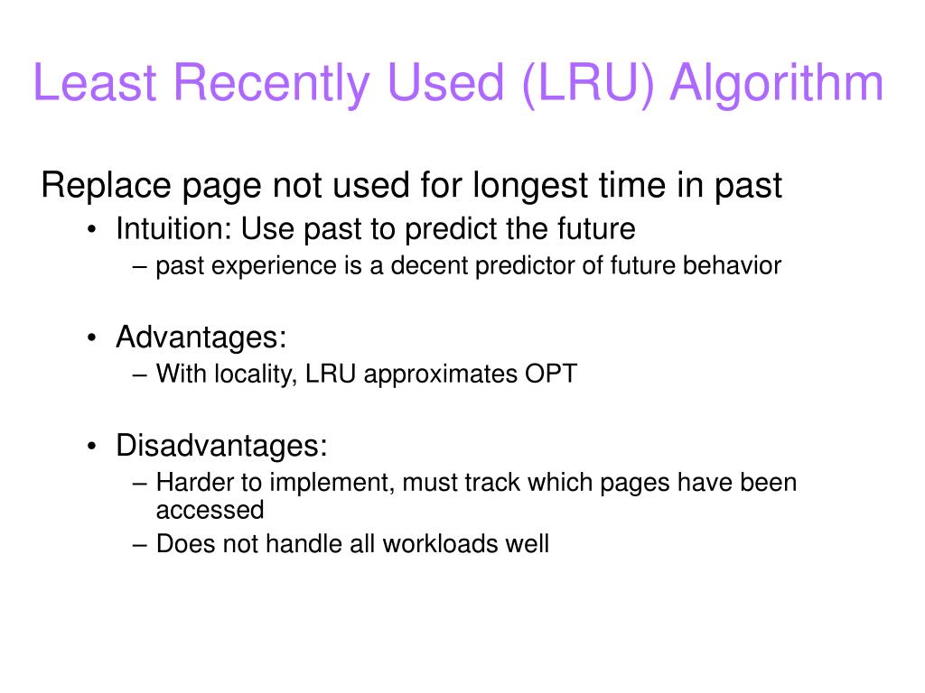 Least Recently Used (LRU) Algorithm • Replace page not used for longest time in past • Intuition: Use past to predict the future • past experience is a decent predictor of future behavior • Advantages: • With locality, LRU approximates OPT • Disadvantages: • Harder to implement, must track which pages have been accessed • Does not handle all workloads well