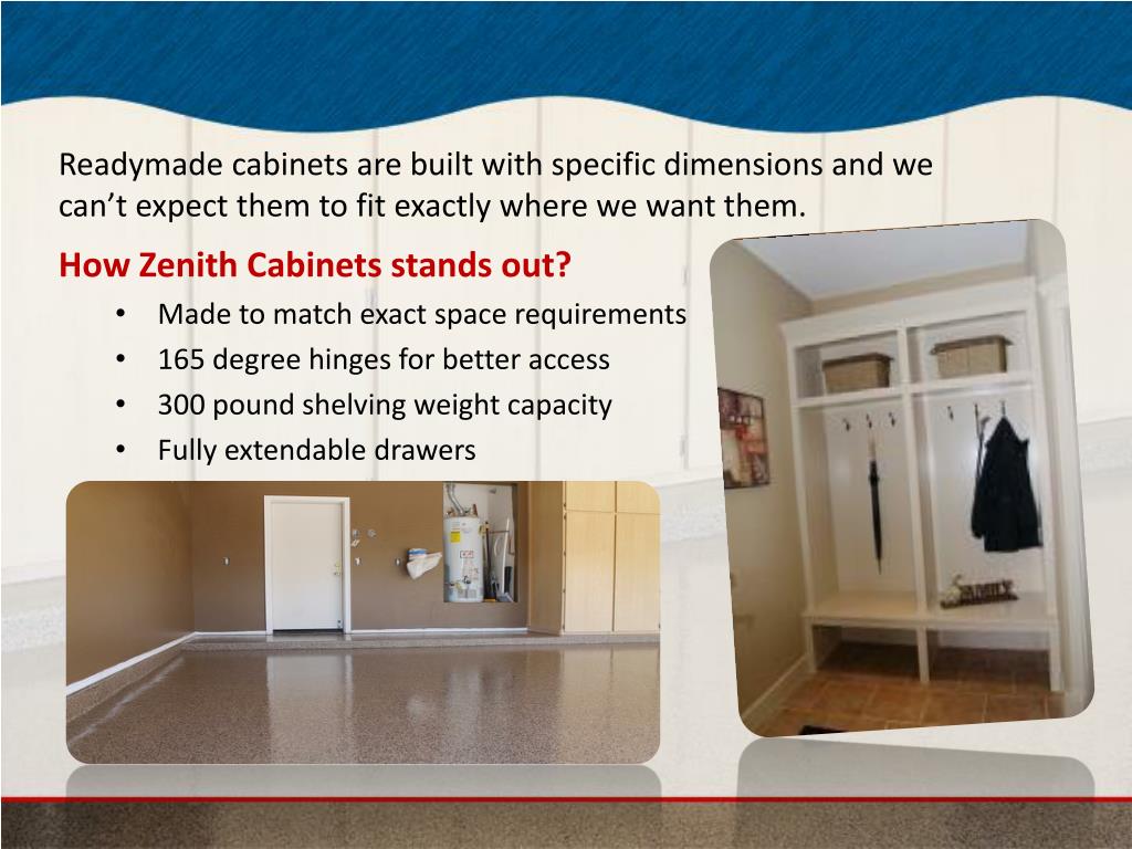 Readymade cabinets are built with specific dimensions and we can’t expect them to fit exactly where we want them. How Zenith Cabinets stands out? Made to match exact space requirements 165 degree hinges for better access 300 pound shelving weight capacity Fully extendable drawers Wide variety of colors and textures
