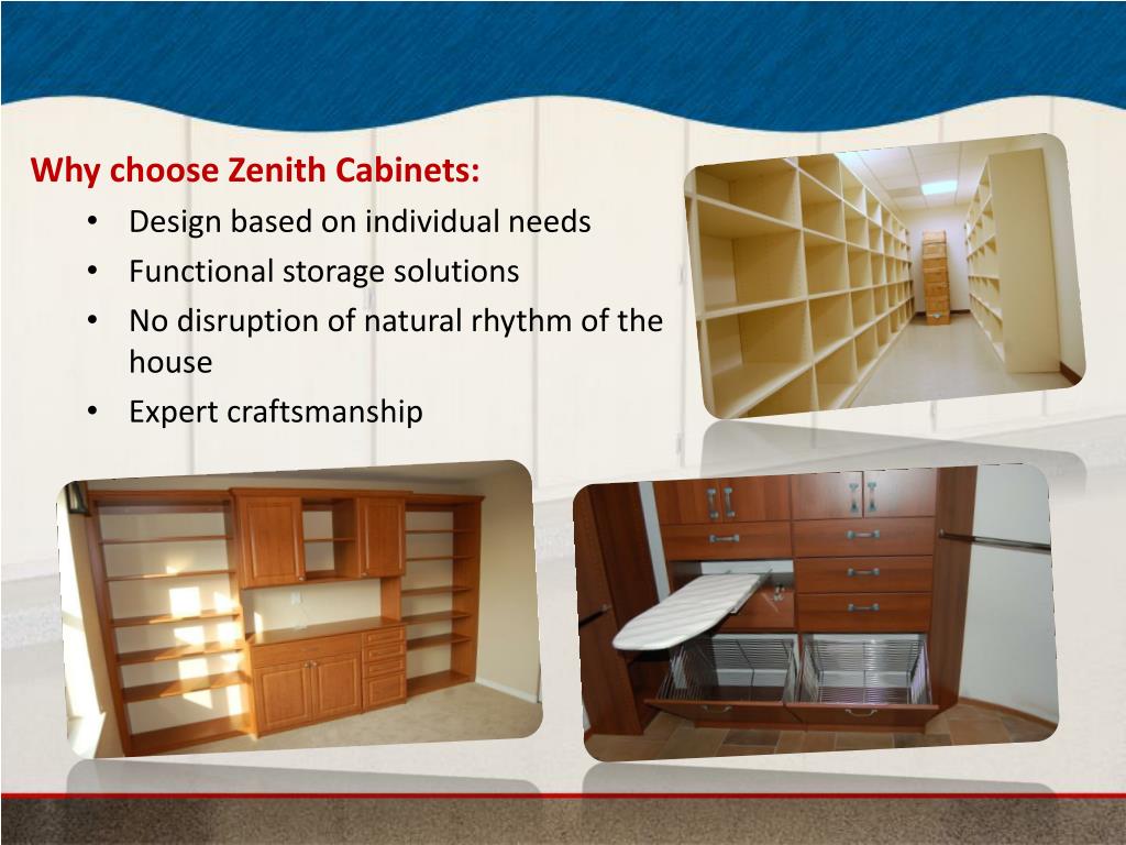 Why choose Zenith Cabinets: Design based on individual needs Functional storage solutions No disruption of natural rhythm of the house Expert craftsmanship