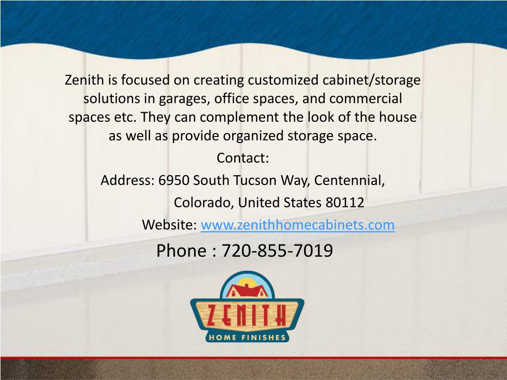 Zenith is focused on creating customized cabinet/storage solutions in garages, office spaces, and commercial spaces etc. They can complement the look of the house as well as provide organized storage space. Contact: Address: 6950 South Tucson Way, Centennial, Colorado, United States 80112 Website: www.zenithhomecabinets.com Phone : 720-855-7019