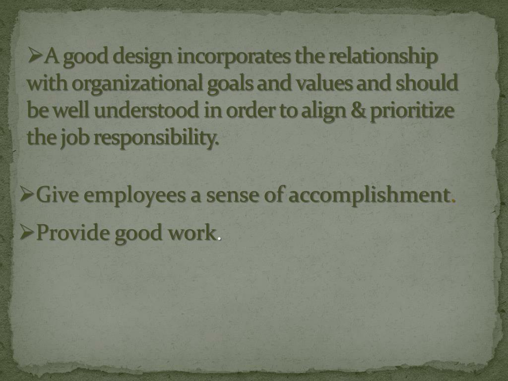 A good design incorporates the relationship with organizational goals and values and should be well understood in order to align & prioritize the job responsibility. • Give employees a sense of accomplishment. • Provide good work.