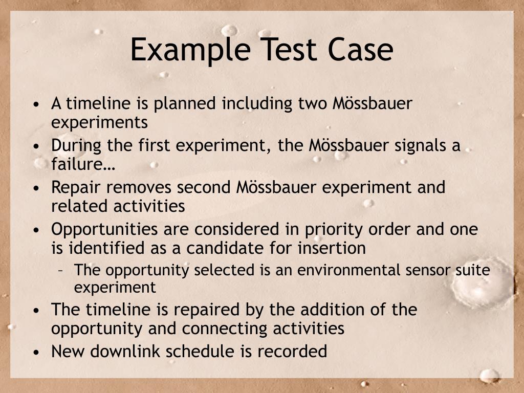 Example Test Case • A timeline is planned including two Mössbauer experiments • During the first experiment, the Mössbauer signals a failure… • Repair removes second Mössbauer experiment and related activities • Opportunities are considered in priority order and one is identified as a candidate for insertion • The opportunity selected is an environmental sensor suite experiment • The timeline is repaired by the addition of the opportunity and connecting activities • New downlink schedule is recorded