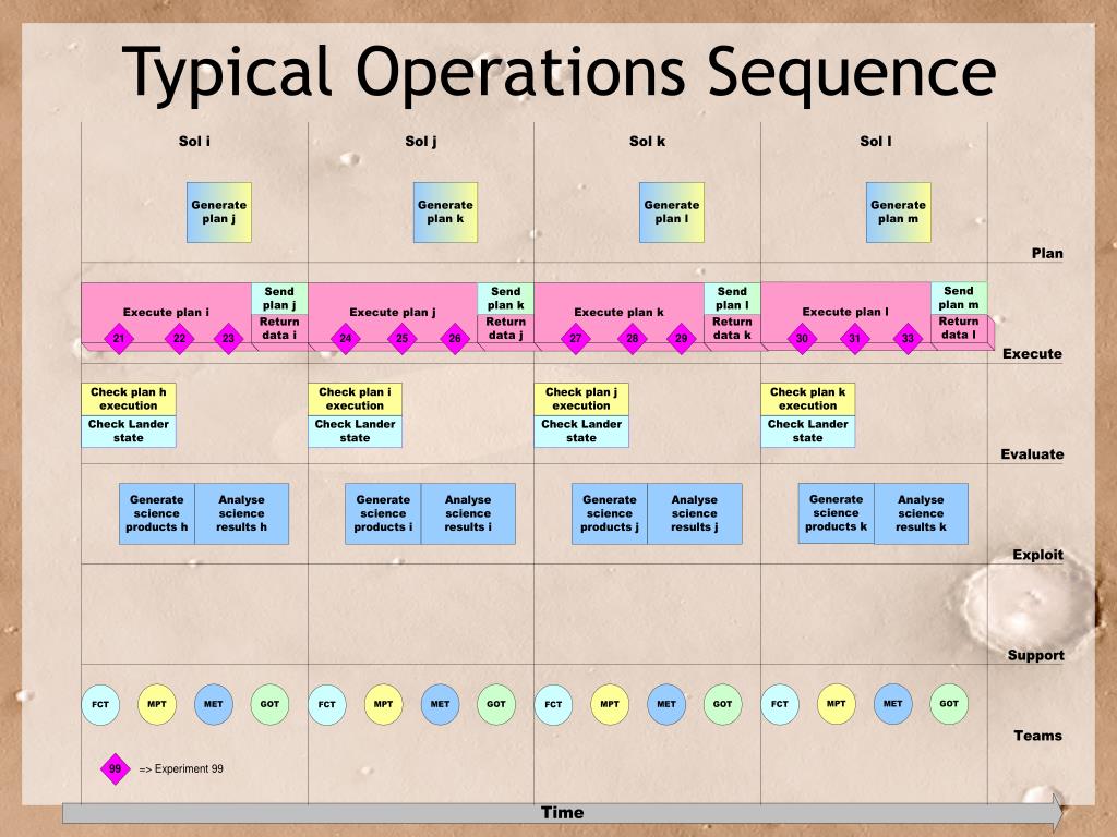 Opportunities: Features • Opportunities are designed as consistent self-contained timeline fragments • Fragments generally represent subplans needed for future operations • Often generic fragments capturing an experimental process consisting of multiple activities, so reusable • Opportunities are designed on the ground, by operations personnel • Constraints make explicit relationships required of lander operations by both scientists and operations personnel
