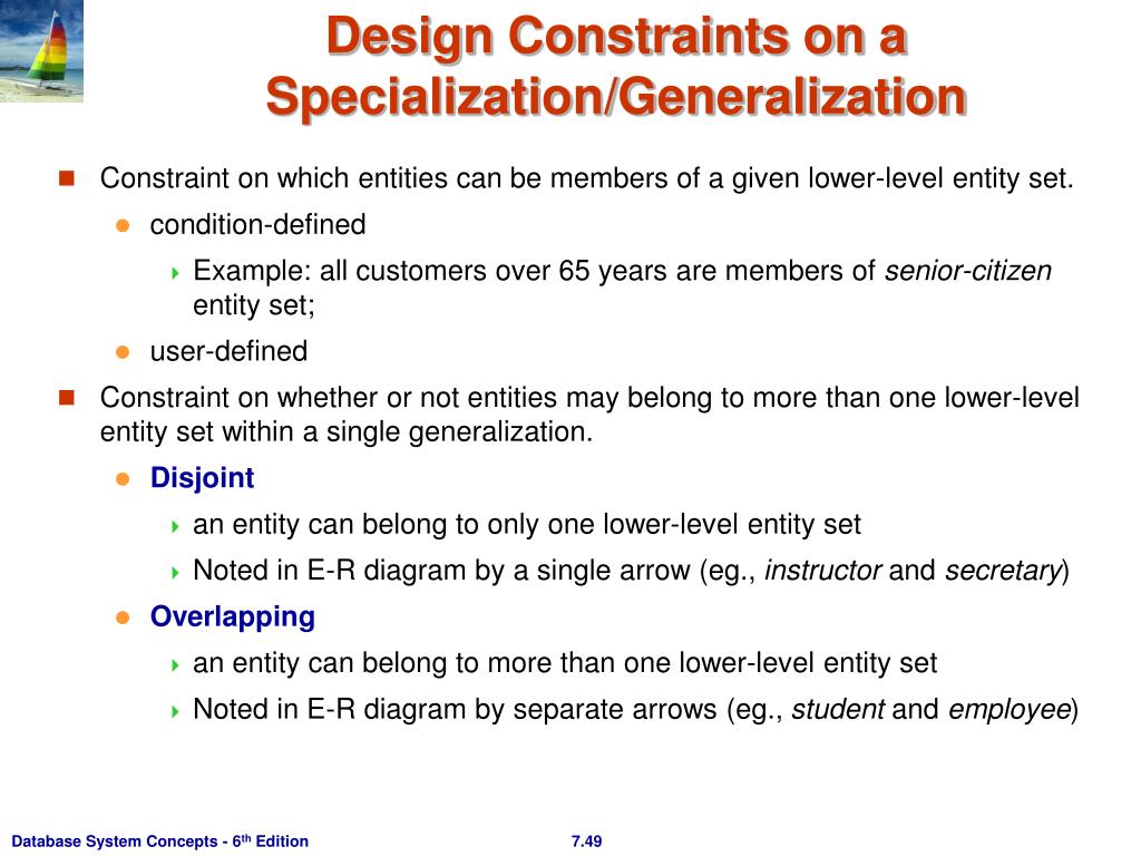 Design Constraints on a Specialization/Generalization • Constraint on which entities can be members of a given lower-level entity set. • condition-defined • Example: all customers over 65 years are members of senior-citizen entity set; • user-defined • Constraint on whether or not entities may belong to more than one lower-level entity set within a single generalization. • Disjoint • an entity can belong to only one lower-level entity set • Noted in E-R diagram by a single arrow (eg., instructor and secretary) • Overlapping • an entity can belong to more than one lower-level entity set • Noted in E-R diagram by separate arrows (eg., student and employee)