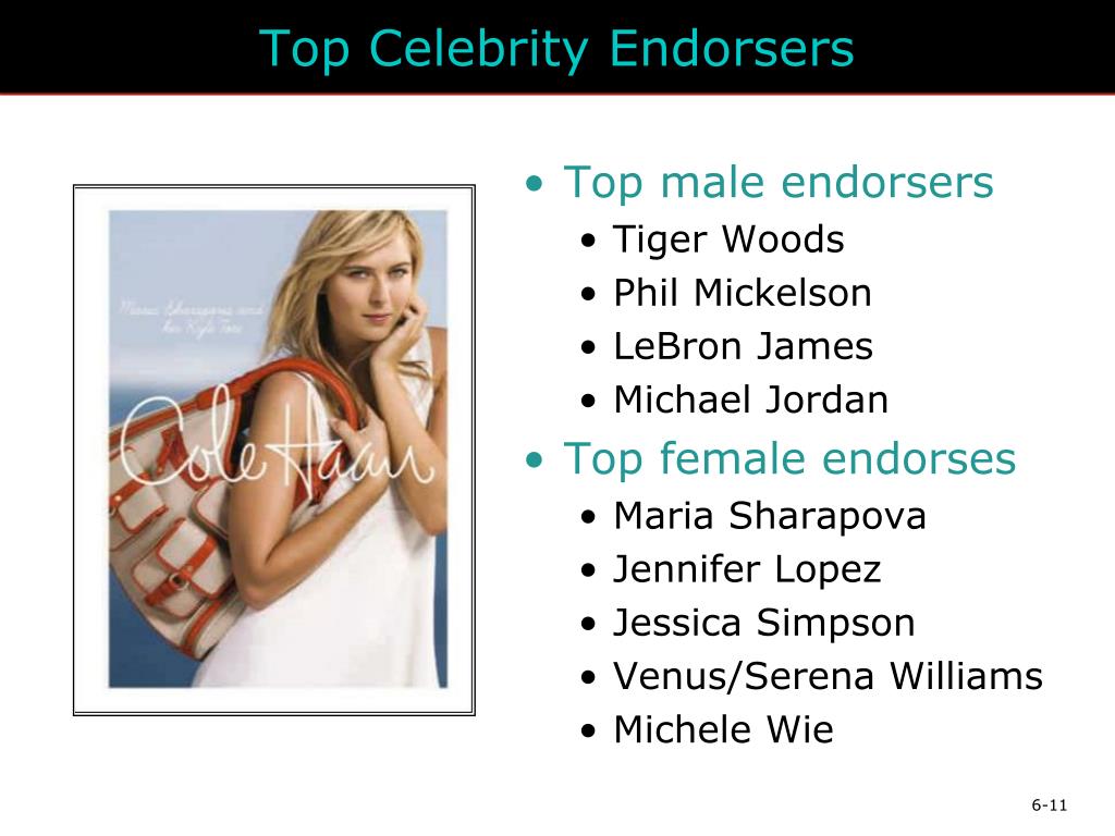 Top Celebrity Endorsers • Top male endorsers • Tiger Woods • Phil Mickelson • LeBron James • Michael Jordan • Top female endorses • Maria Sharapova • Jennifer Lopez • Jessica Simpson • Venus/Serena Williams • Michele Wie