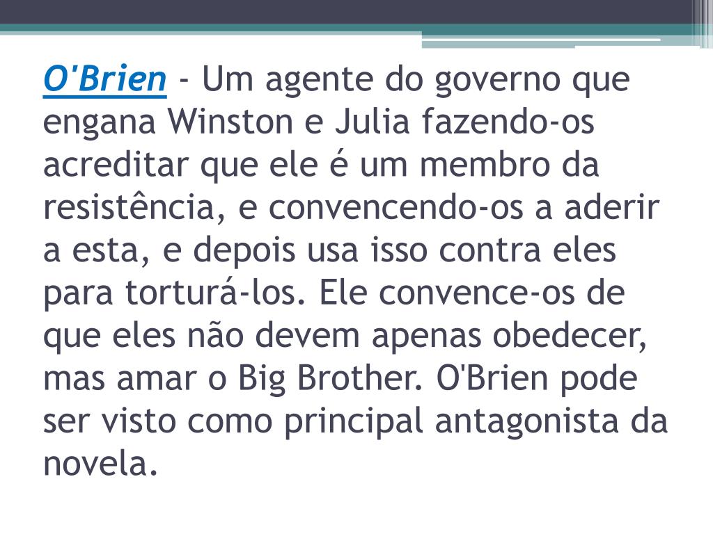 O'Brien - Um agente do governo que engana Winston e Julia fazendo-os acreditar que ele é um membro da resistência, e convencendo-os a aderir a esta, e depois usa isso contra eles para torturá-los. Ele convence-os de que eles não devem apenas obedecer, mas amar o Big Brother. O'Brien pode ser visto como principal antagonista da novela.