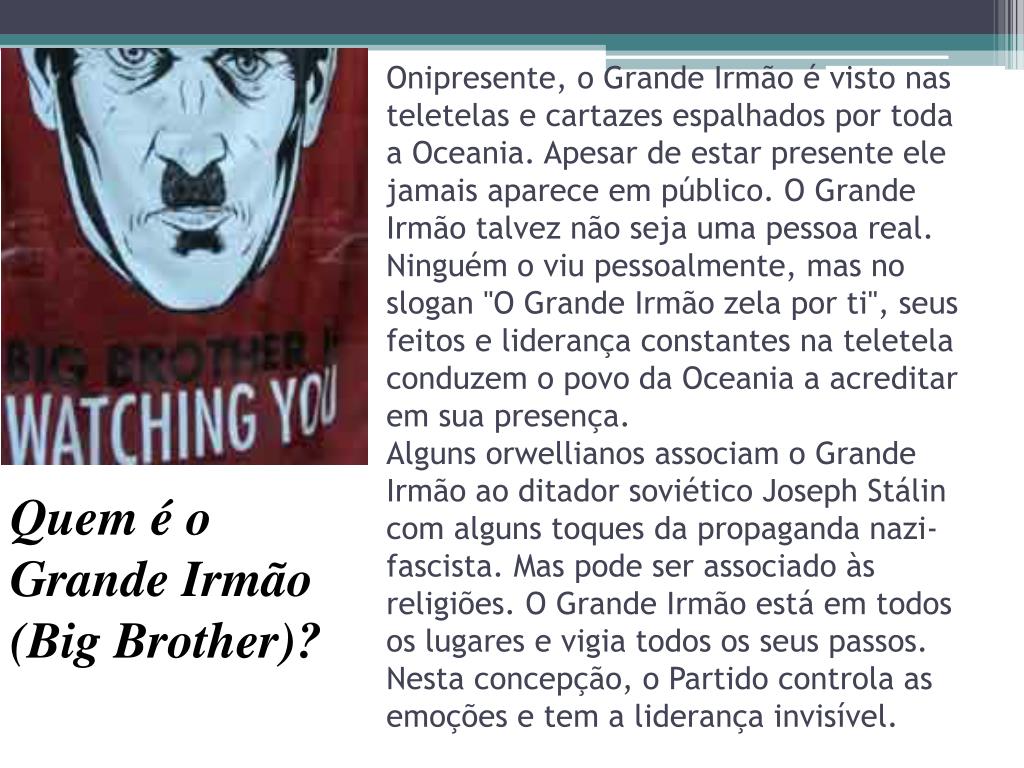 Onipresente, o Grande Irmão é visto nas teletelas e cartazes espalhados por toda a Oceania. Apesar de estar presente ele jamais aparece em público. O Grande Irmão talvez não seja uma pessoa real. Ninguém o viu pessoalmente, mas no slogan "O Grande Irmão zela por ti", seus feitos e liderança constantes na teletela conduzem o povo da Oceania a acreditar em sua presença.Alguns orwellianos associam o Grande Irmão ao ditador soviético Joseph Stálin com alguns toques da propaganda nazi-fascista. Mas pode ser associado às religiões. O Grande Irmão está em todos os lugares e vigia todos os seus passos. Nesta concepção, o Partido controla as emoções e tem a liderança invisível. Quem é o Grande Irmão (Big Brother)?