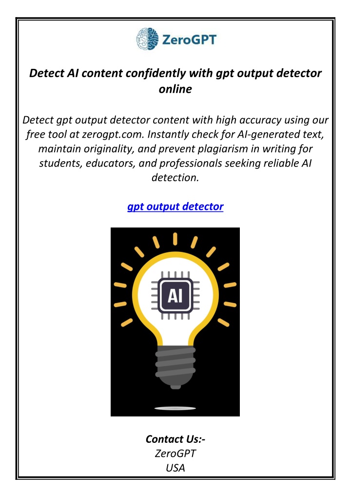 Detect AI content confidently with gpt output detector online Detect gpt output detector content with high accuracy using our free tool at zerogpt.com. Instantly check for AI-generated text, maintain originality, and prevent plagiarism in writing for students, educators, and professionals seeking reliable AI detection. gpt output detector Contact Us:- ZeroGPT USA