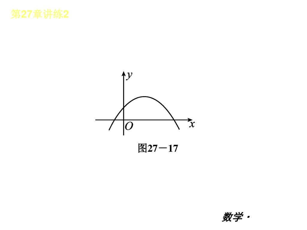 第27章讲练2 ┃ 试卷讲练 【针对第15题训练】 1.二次函数的图象如图27-17所示,则下列结论正确的是() A.a<0,b<0,c<0,b2-4ac>0 B.a>0,b<0,c>0,b2-4ac<0 C.a<0,b>0,c<0,b2-4ac>0 D.a<0,b>0,c>0,b2-4ac>0 D 数学·新课标(HS)