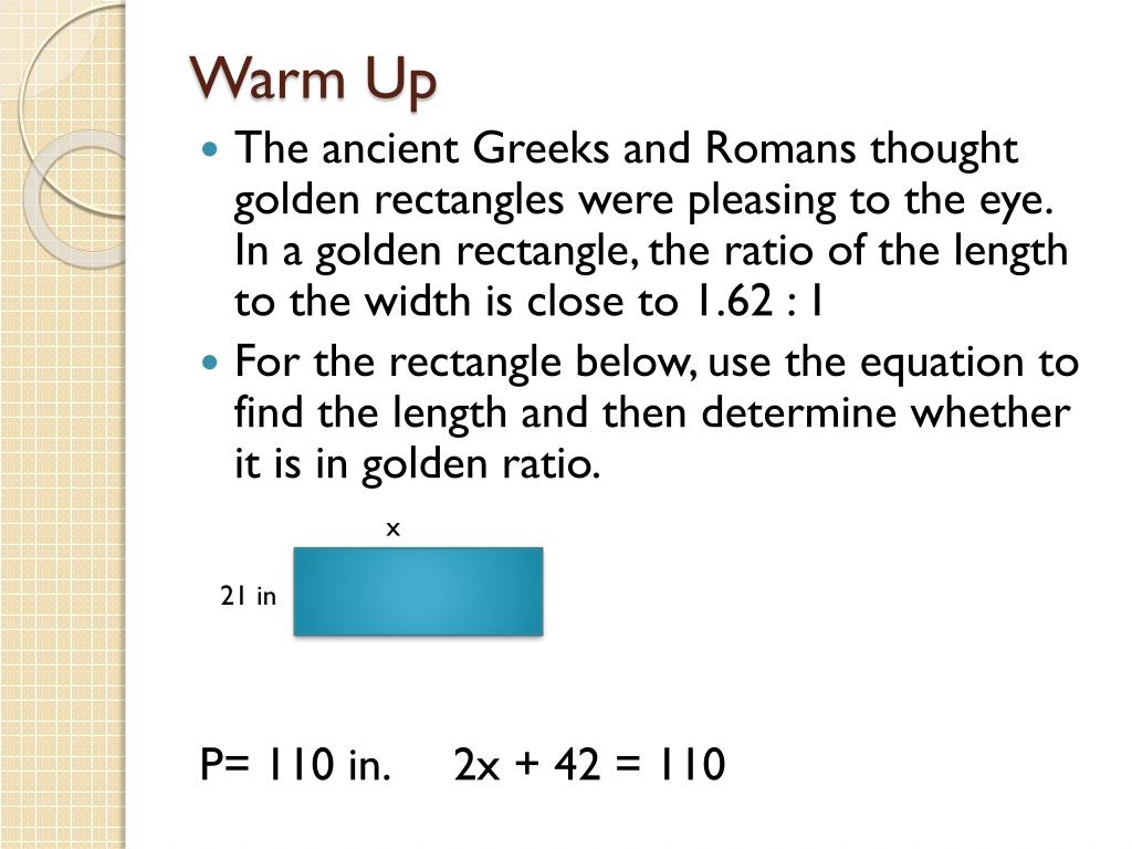 Warm Up • The ancient Greeks and Romans thought golden rectangles were pleasing to the eye. In a golden rectangle, the ratio of the length to the width is close to 1.62 : 1 • For the rectangle below, use the equation to find the length and then determine whether it is in golden ratio. P= 110 in. 2x + 42 = 110 x 21 in