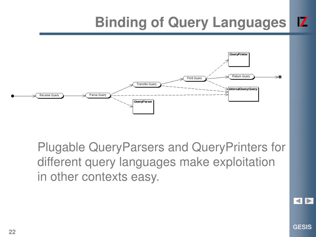 Binding of Query Languages • Plugable QueryParsers and QueryPrinters for different query languages make exploitation in other contexts easy.