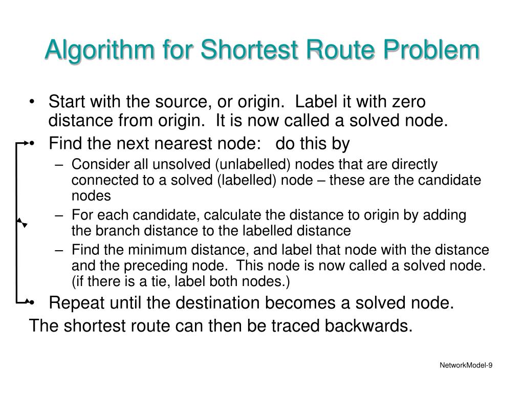 Algorithm for Shortest Route Problem • Start with the source, or origin. Label it with zero distance from origin. It is now called a solved node. • Find the next nearest node: do this by • Consider all unsolved (unlabelled) nodes that are directly connected to a solved (labelled) node – these are the candidate nodes • For each candidate, calculate the distance to origin by adding the branch distance to the labelled distance • Find the minimum distance, and label that node with the distance and the preceding node. This node is now called a solved node. (if there is a tie, label both nodes.) • Repeat until the destination becomes a solved node. The shortest route can then be traced backwards.