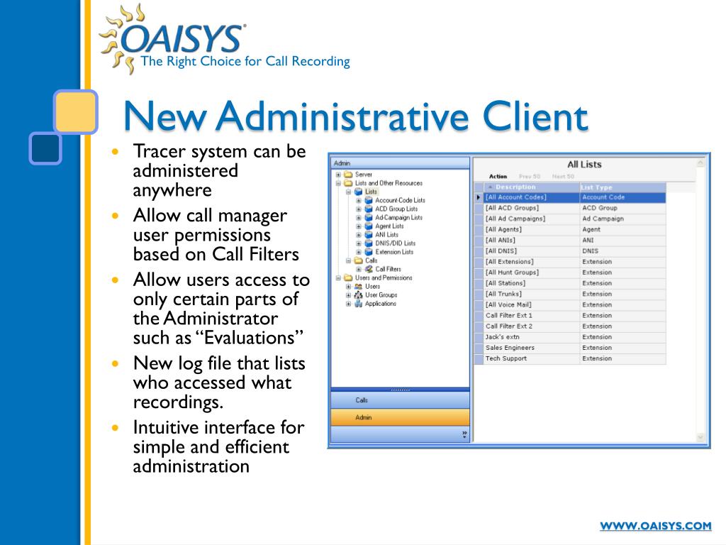 New Administrative Client • Tracer system can be administered anywhere • Allow call manager user permissions based on Call Filters • Allow users access to only certain parts of the Administrator such as “Evaluations” • New log file that lists who accessed what recordings. • Intuitive interface for simple and efficient administration