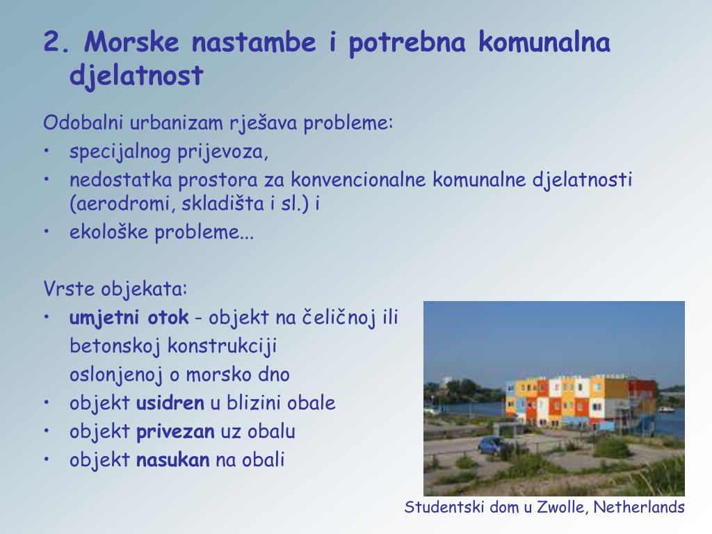 2. Morske nastambe i potrebna komunalna djelatnost Odobalni urbanizam rješava probleme: • specijalnog prijevoza, • nedostatka prostora za konvencionalne komunalne djelatnosti (aerodromi, skladišta i sl.) i • ekološke probleme... Vrste objekata: • umjetni otok - objekt na čeličnoj ili betonskoj konstrukciji oslonjenoj o morsko dno • objekt usidren u blizini obale • objekt privezan uz obalu • objekt nasukan na obali Studentski dom u Zwolle, Netherlands