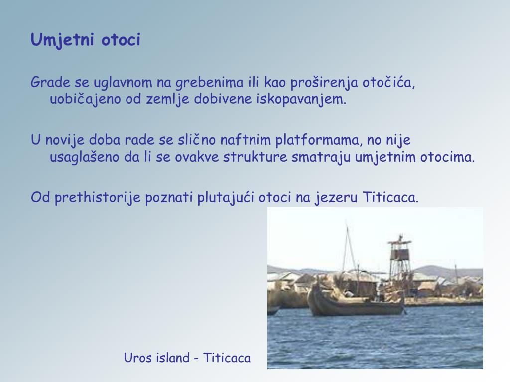 Umjetni otoci Grade se uglavnom na grebenima ili kao proširenja otočića, uobičajeno od zemlje dobivene iskopavanjem. U novije doba rade se slično naftnim platformama, no nije usaglašeno da li se ovakve strukture smatraju umjetnim otocima. Od prethistorije poznati plutajući otoci na jezeru Titicaca. Uros island - Titicaca