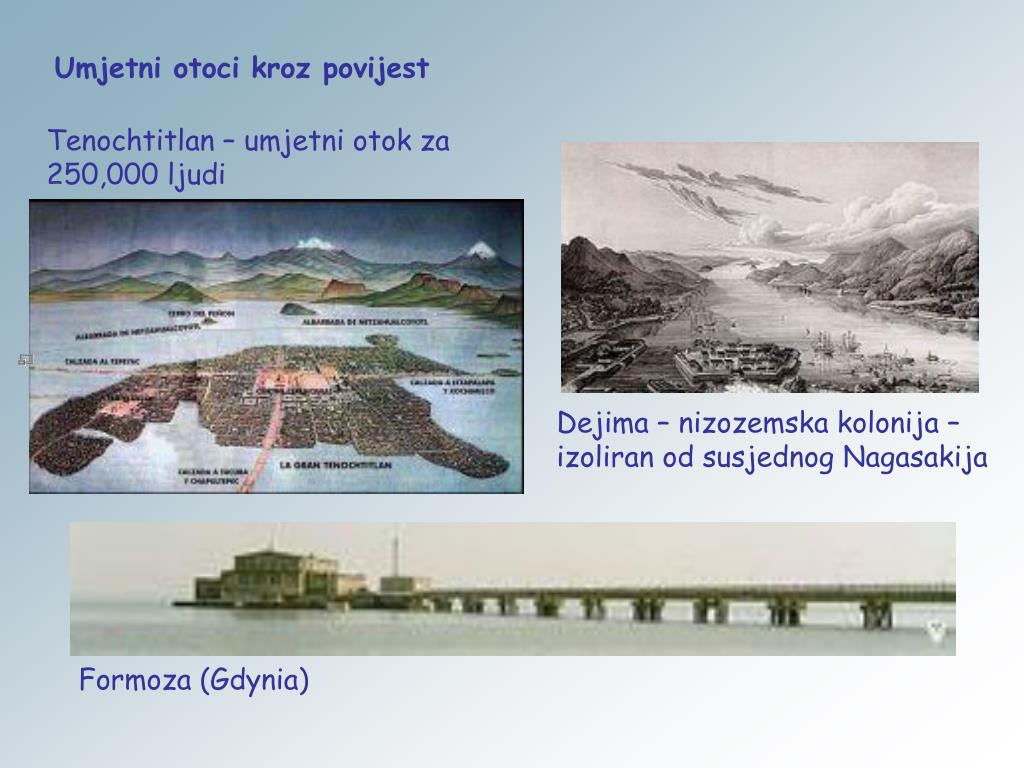 Umjetni otoci kroz povijest Tenochtitlan – umjetni otok za 250,000 ljudi Dejima – nizozemska kolonija – izoliran od susjednog Nagasakija Formoza (Gdynia)