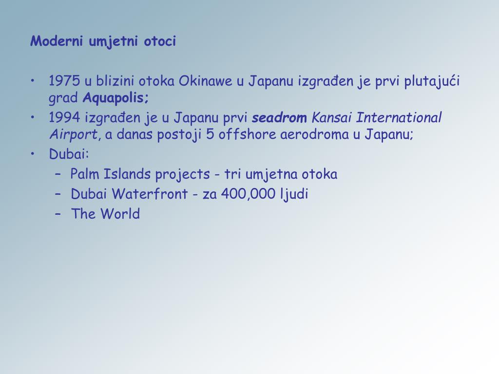 Moderni umjetni otoci • 1975 u blizini otoka Okinawe u Japanu izgrađen je prvi plutajući grad Aquapolis; • 1994 izgrađen je u Japanu prvi seadromKansai International Airport, a danas postoji 5 offshore aerodroma u Japanu; • Dubai: • Palm Islands projects - tri umjetna otoka • Dubai Waterfront - za 400,000 ljudi • The World