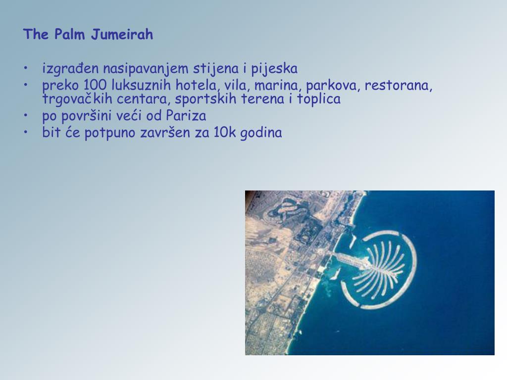 The Palm Jumeirah • izgrađen nasipavanjem stijena i pijeska • preko 100 luksuznih hotela, vila, marina, parkova, restorana, trgovačkih centara, sportskih terena i toplica • po površini veći od Pariza • bit će potpuno završen za 10k godina
