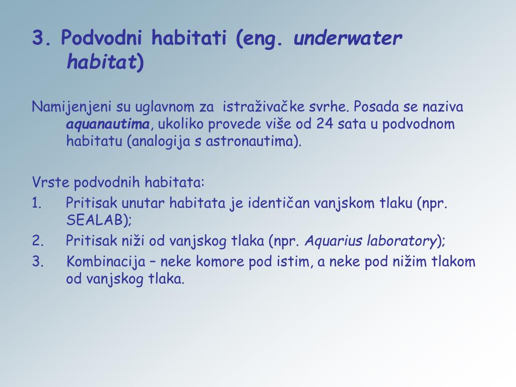 3. Podvodni habitati (eng. underwater habitat) Namijenjeni su uglavnom za istraživačke svrhe. Posada se naziva aquanautima, ukoliko provede više od 24 sata u podvodnom habitatu (analogija s astronautima). Vrste podvodnih habitata: • Pritisak unutar habitata je identičan vanjskom tlaku (npr. SEALAB); • Pritisak niži od vanjskog tlaka (npr. Aquarius laboratory); • Kombinacija – neke komore pod istim, a neke pod nižim tlakom od vanjskog tlaka.