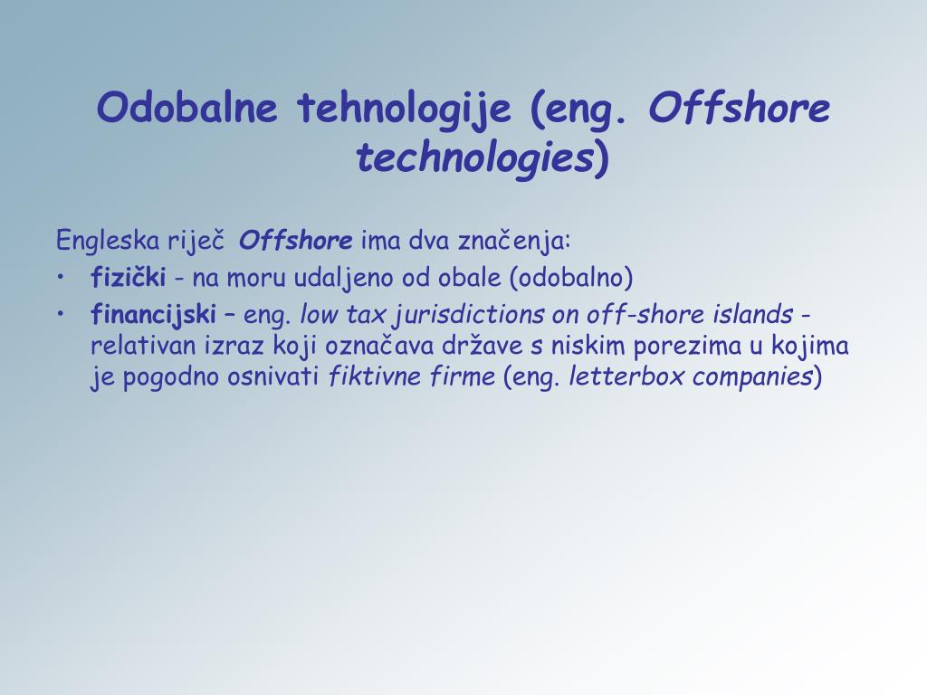 Odobalne tehnologije (eng. Offshore technologies) Engleska riječOffshore ima dva značenja: • fizički - na moru udaljeno od obale (odobalno) • financijski – eng. low tax jurisdictionson off-shore islands - relativan izraz koji označava države s niskim porezima u kojima je pogodno osnivati fiktivne firme (eng. letterbox companies)
