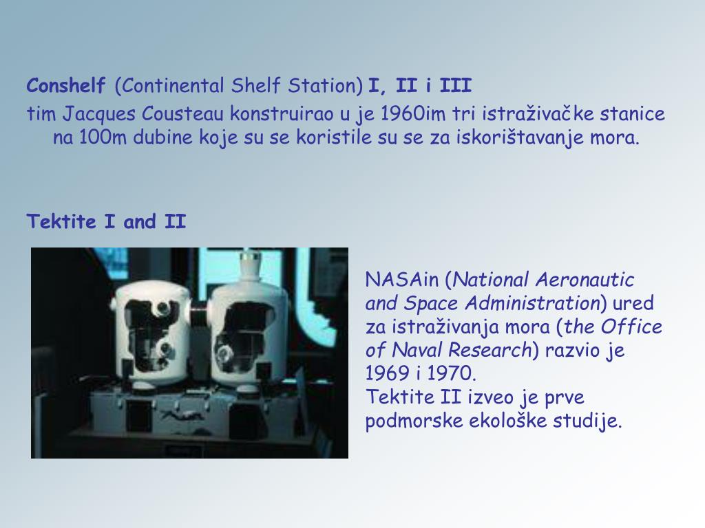 Conshelf (Continental Shelf Station) I, II i III tim Jacques Cousteau konstruirao u je 1960im tri istraživačke stanice na 100m dubine koje su se koristile su se za iskorištavanje mora. Tektite I and II NASAin (National Aeronautic and Space Administration) ured za istraživanja mora (the Office of Naval Research) razvio je 1969 i 1970. Tektite II izveo je prve podmorske ekološke studije.