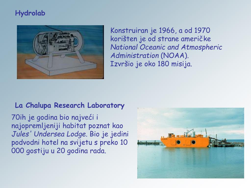 Hydrolab La Chalupa Research Laboratory • Konstruiran je 1966, a od 1970 korišten je od strane američke National Oceanic and Atmospheric Administration (NOAA). • Izvršio je oko 180 misija. • 70ih je godina bio najveći i najopremljeniji habitat poznat kao Jules' Undersea Lodge. Bio je jedini podvodni hotel na svijetu s preko 10 000 gostiju u 20 godina rada.