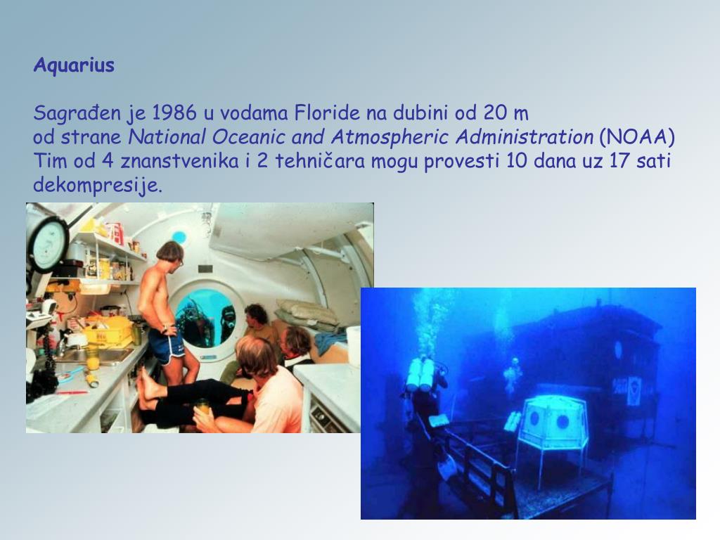 Aquarius Sagrađen je 1986 u vodama Floride na dubini od 20 m od strane National Oceanic and Atmospheric Administration (NOAA) Tim od 4 znanstvenika i 2 tehničara mogu provesti 10 dana uz 17 sati dekompresije.