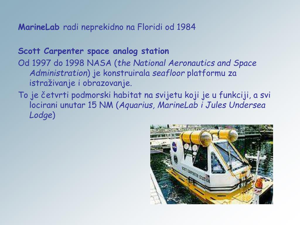 MarineLab radi neprekidno na Floridi od 1984 Scott Carpenter space analog station Od 1997 do 1998 NASA (the National Aeronautics and Space Administration) je konstruirala seafloor platformu za istraživanje i obrazovanje. To je četvrti podmorski habitat na svijetu koji je u funkciji, a svi locirani unutar 15 NM (Aquarius, MarineLab i Jules Undersea Lodge)