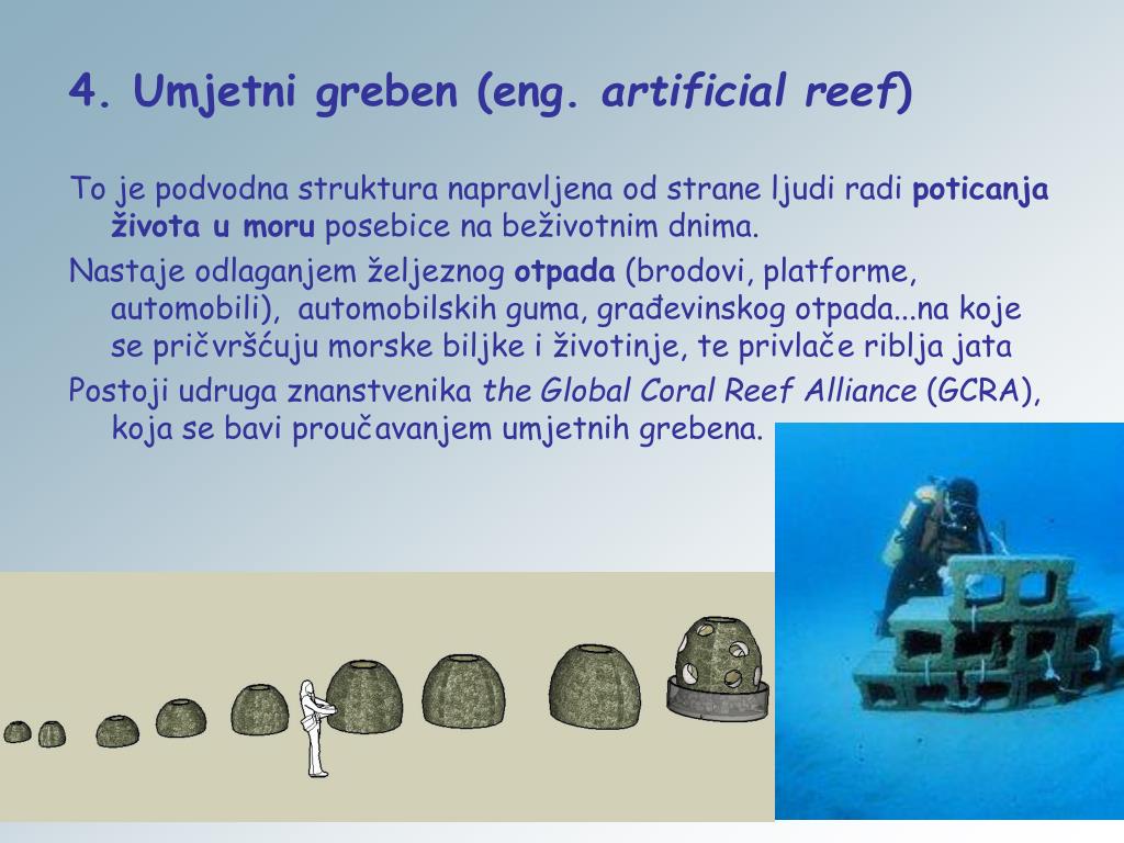 4. Umjetni greben (eng. artificial reef) To je podvodna struktura napravljena od strane ljudi radi poticanja života u moru posebice na beživotnim dnima. Nastaje odlaganjem željeznog otpada (brodovi, platforme, automobili), automobilskih guma, građevinskog otpada...na koje se pričvršćuju morske biljke i životinje, te privlače riblja jata Postoji udruga znanstvenika the Global Coral Reef Alliance (GCRA), koja se bavi proučavanjem umjetnih grebena.