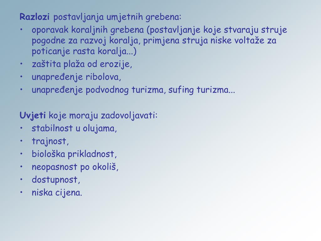 Razlozi postavljanja umjetnih grebena: • oporavak koraljnih grebena (postavljanje koje stvaraju struje pogodne za razvoj koralja, primjena struja niske voltaže za poticanje rasta koralja...) • zaštita plaža od erozije, • unapređenje ribolova, • unapređenje podvodnog turizma, sufing turizma... Uvjeti koje moraju zadovoljavati: • stabilnost u olujama, • trajnost, • biološka prikladnost, • neopasnost po okoliš, • dostupnost, • niska cijena.