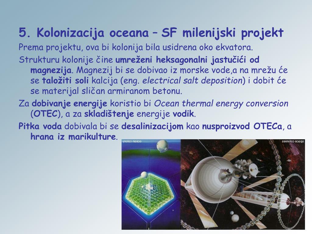 5. Kolonizacija oceana – SF milenijski projekt Prema projektu, ova bi kolonija bila usidrena oko ekvatora. Strukturu kolonije čine umreženi heksagonalni jastučići od magnezija. Magnezij bi se dobivao iz morske vode,a na mrežu će se taložiti soli kalcija (eng. electrical salt deposition) i dobit će se materijal sličan armiranom betonu. Za dobivanjeenergije koristio bi Ocean thermal energy conversion (OTEC), a za skladištenje energije vodik. Pitka voda dobivala bi se desalinizacijom kao nusproizvod OTECa, a hrana iz marikulture.