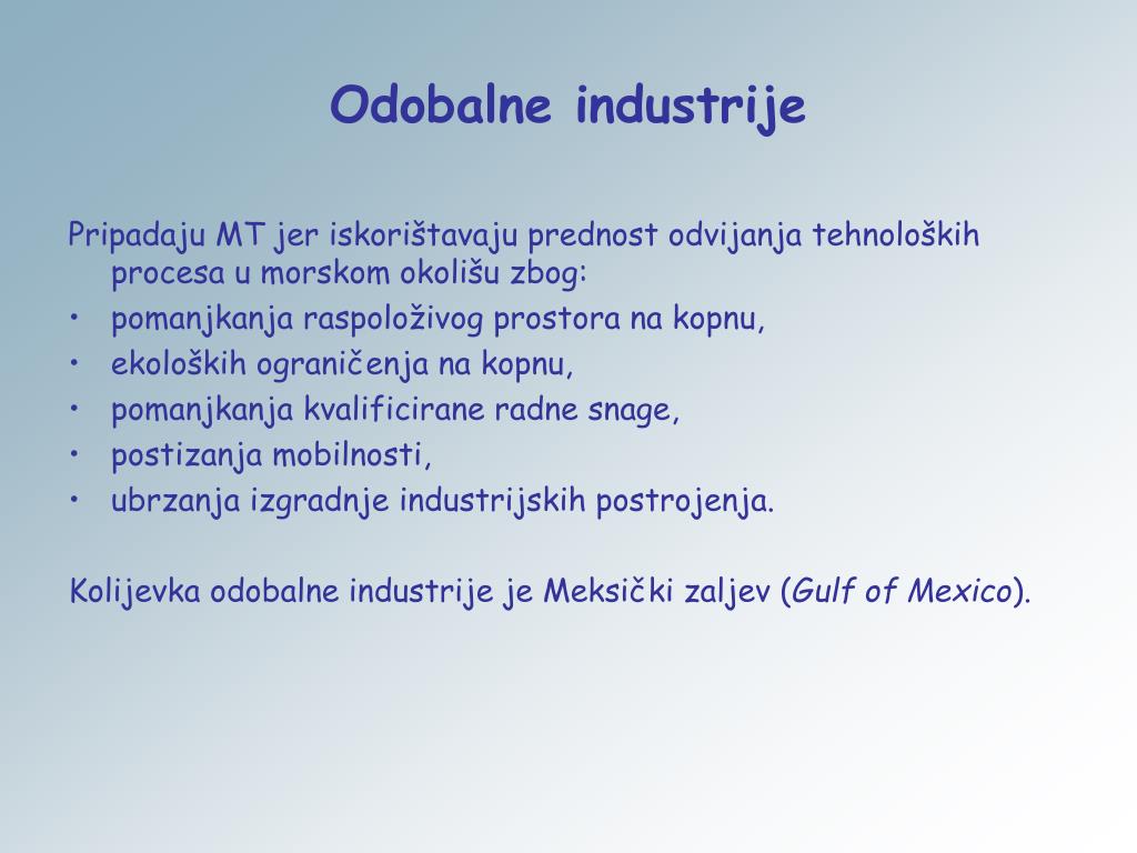 Odobalne industrije Pripadaju MT jer iskorištavaju prednost odvijanja tehnoloških procesa u morskom okolišu zbog: • pomanjkanja raspoloživog prostora na kopnu, • ekoloških ograničenja na kopnu, • pomanjkanja kvalificirane radne snage, • postizanja mobilnosti, • ubrzanja izgradnje industrijskih postrojenja. Kolijevka odobalne industrije je Meksički zaljev (Gulf of Mexico).